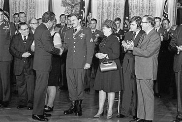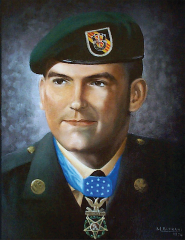 On his second trip with the wounded, he was clubbed from additional wounds to his head and arms before killing his adversary. He then continued under devastating fire to carry the wounded to the helicopter. Upon reaching the aircraft, he spotted and killed two enemy soldiers who were rushing the craft from an angle that prevented the aircraft door-gunner from firing upon them. With little strength remaining, he made one last trip to the perimeter to ensure that all classified material had been collected or destroyed and to bring in the remaining wounded. Only then, in extremely serious condition from numerous wounds and loss of blood, did he allow himself to be pulled into the extraction aircraft.